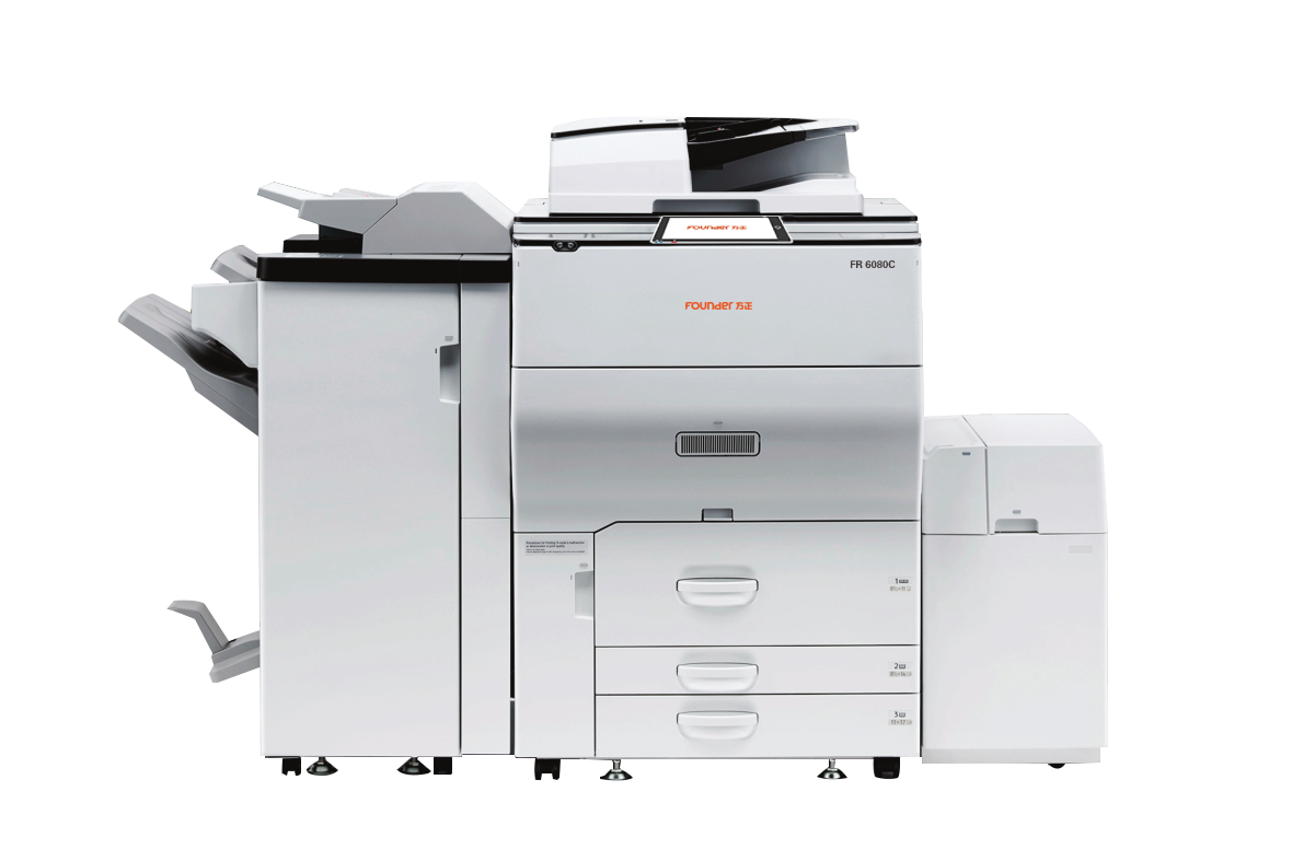 2.7强大的扫描功能:方正FR6080C彩色数码复印机,具备强大的扫描功能,标配220页双面同步自动进纸器,一次扫描可读取双面原稿的正反面,单面扫描速度高达120页每分钟,双面扫描速度高达220页每分钟, 扫描文件可以发送到U盘,SD卡,硬盘,文件夹或邮箱,堪比一台A3高速扫描仪。 2.8高性能:方正FR6080C是一台高性能彩色数码复印机,采用生产型设备的引擎技术,一次发射40束激光,月打印量高达15万页,达到生产型设备要求,首页输出时间黑白4.7秒,彩色6.3秒,标配3700页容量纸盒,可扩展到8100页,还可以将两台FR6080C串联,实现160页每分钟的高速连续输出,主机内备有副碳粉仓,确保碳粉瓶碳粉用尽时,也可使用副碳粉仓继续输出。 2.9扩展性强:方正FR6080C彩色数码复印机,充分考虑到日常办公需求,集打印,复印,扫描,网络,文件管理功能于一体;可选配小册子装订器,多功能折页器,打孔选购件,大容量纸盒,实现角钉,平钉,骑马钉的装订功能。